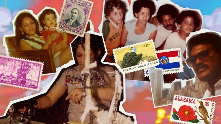 Gina Arias' (left) and Fred Ones' families (right) remember transitioning their families to life in the U.S. From left to right: Gina Arias' mother, Nelly Arias, holding her as a child in 1972; Nelly Arias working in a New York factory; Fred Ones' family, including brother Guido Perdomo, mother Fabiola Sepulveda, father Freddy Sepulveda and Ones' as a child; Freddy Sepulveda before the Twin Towers in New York. Collage and Illustration by Moy Zhong. Photography courtesy of Gina Arias, Bureau of Engraving and Printing, Fred Ones and Wikimedia Commons.