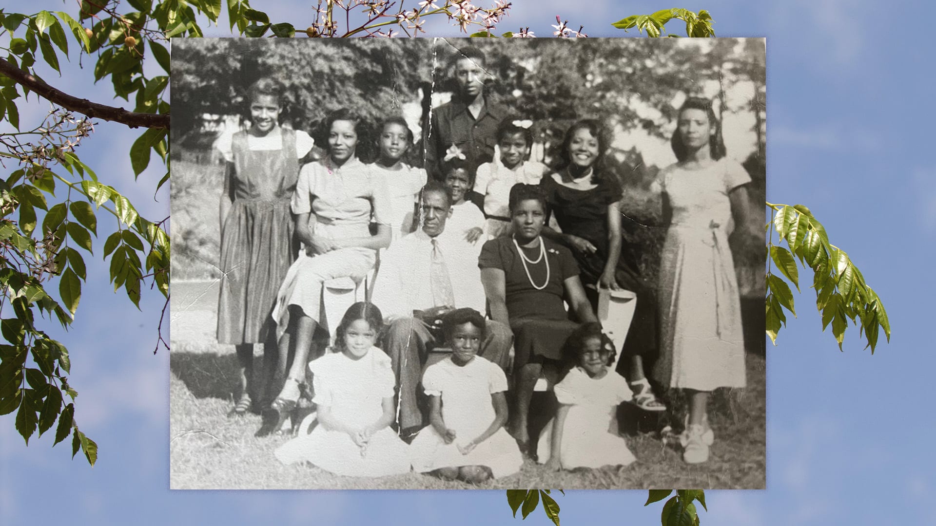 Front: Patricia Williams as a child (front right) poses with her family in the 1950s, which is about the time her upcoming novel "Place" is set. Behind: Chinaberry trees. Courtesy of Patricia Williams and Zeynel Cebeci/Wikimedia Commons/CC BY-SA 4.0