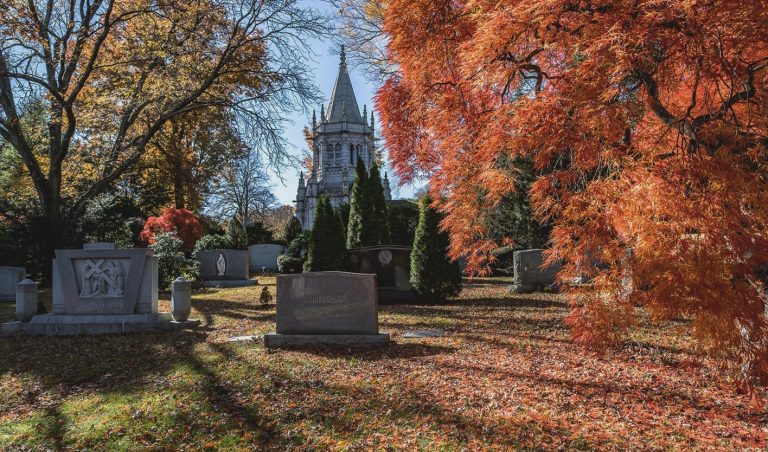 The mausoleum for Wall Street stockbroker John Harbeck was designed by the makers of the New York Public Library in 1910. It towers over Woodland Cemetery with its 90-foot steeple, bronze doors, and extravagant look and feel. Courtesy of Barbara Selesky
