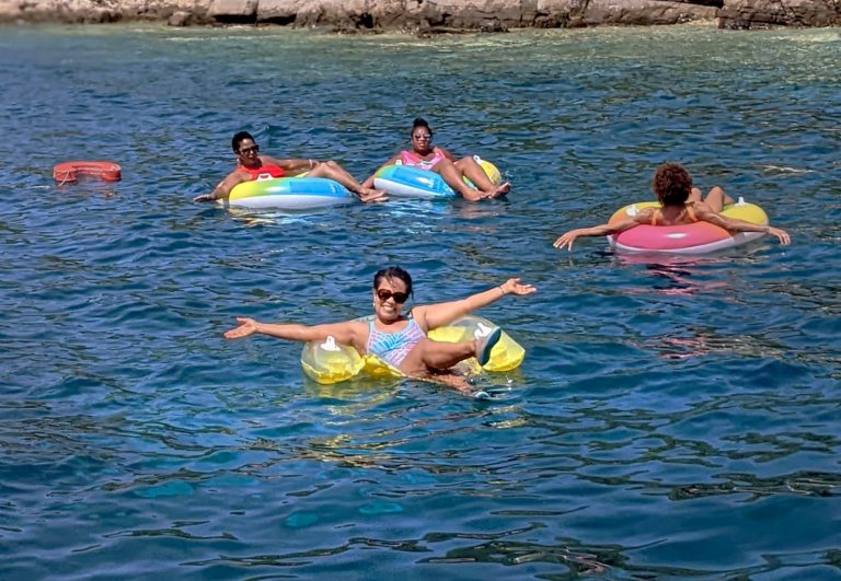 Nita Wiggins (front) feeling lighter and floating in the Adriatic Sea this August. Wiggins took her trip with 30 other Black women as part of DETOUR’s Editor-in-Chief Dawn Booker’s Pack Light Global expeditions program. Courtesy of Sarah Baldwin